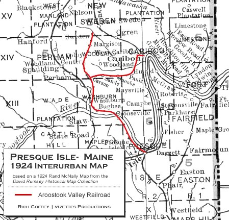 The Aroostook Valley Railroad was a railroad that operated between Presque Isle and Caribou, Maine from the early 1900s to 1996. The railroad operated maroon interurban cars with gray roofs until 1945. Passenger service to New Sweden was discontinued in the late 1930s.