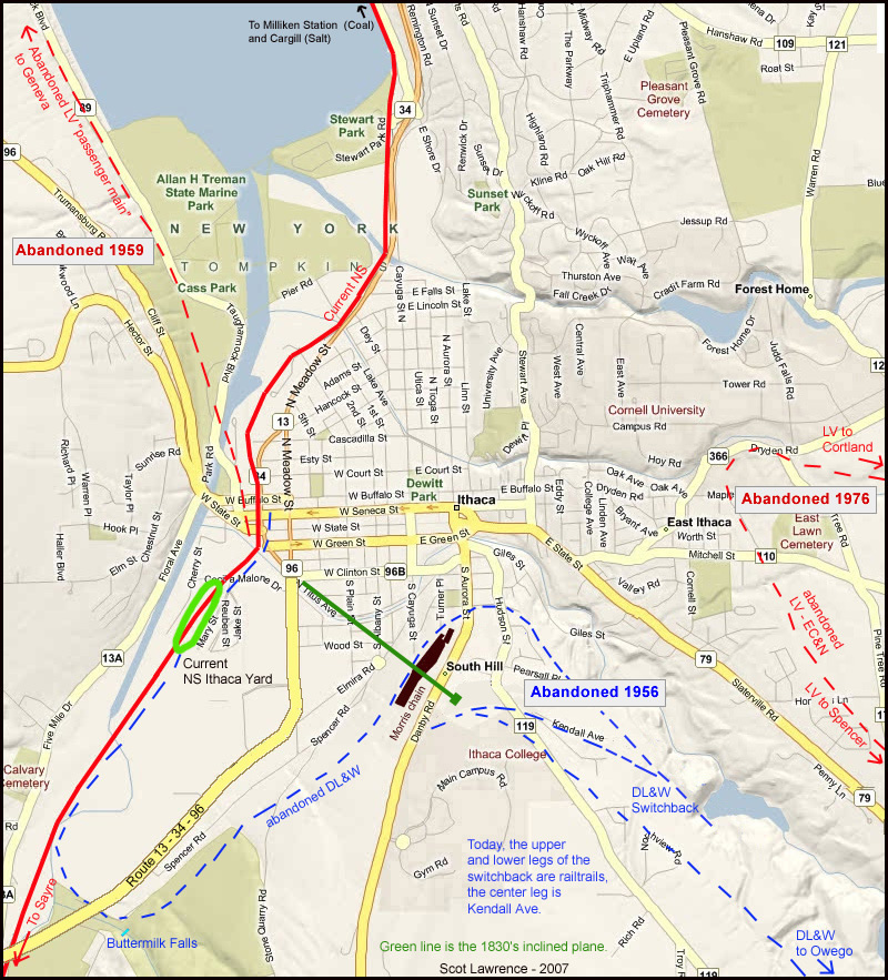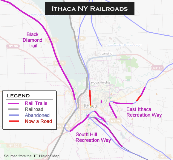 - The East Ithaca Recreation Way on East Hill is primarily built upon the rail bed of the old Ithaca & Cortland RR, which later became part of the Lehigh Valley RR.