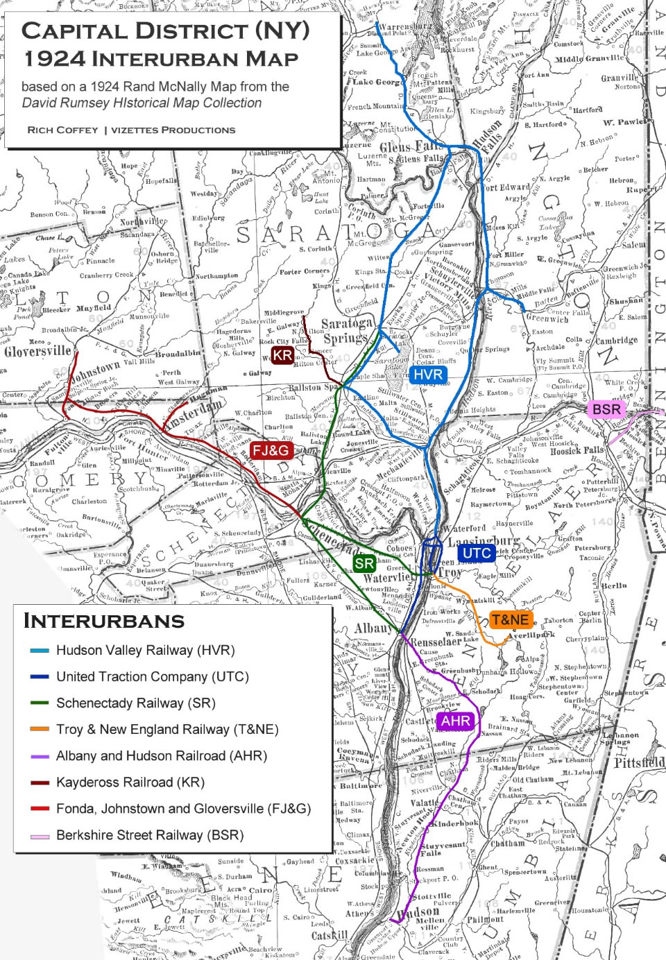 It turns out the Capital District area was criss-crossed by a large bustling interconnected interurban system. At is peak there where 100s of miles of track built and wired exclusively for electric trolleys that served the area's growing transportation needs.